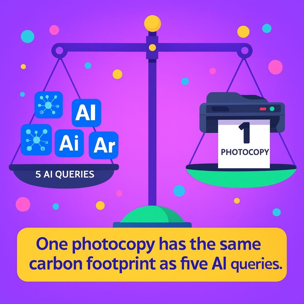 - A photocopy, when you include the impact of paper and toner, uses five times more energy than an AI query.