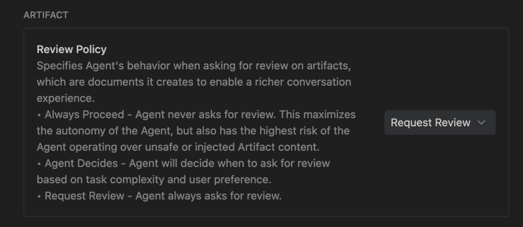 - Forced Request Review for all Terminal, Artifact, and Browser actions.