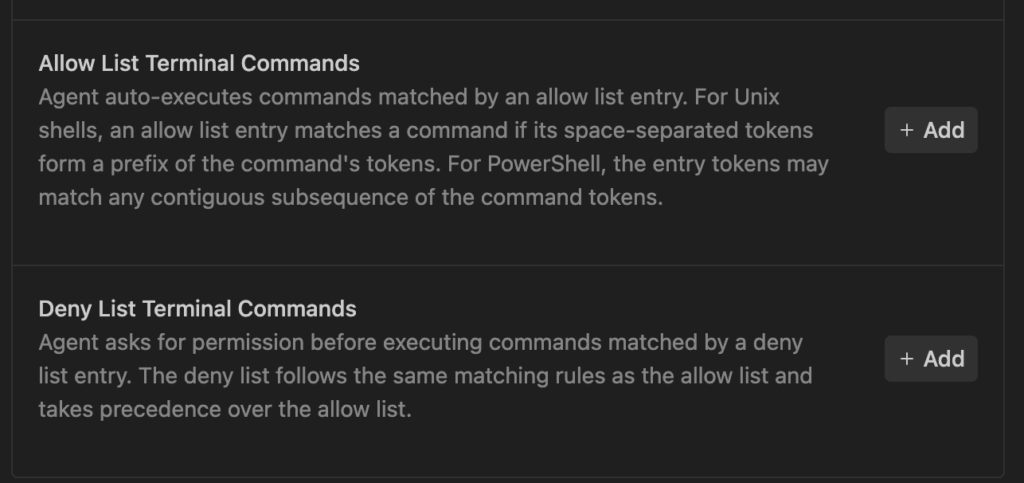 - Allow List (Prefixes): Safe commands like npm test, ls, or git status.