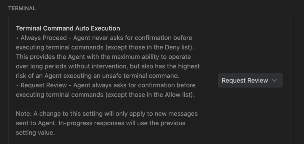 | Terminal Execution | Request Review | Agent Decides / Allow List |