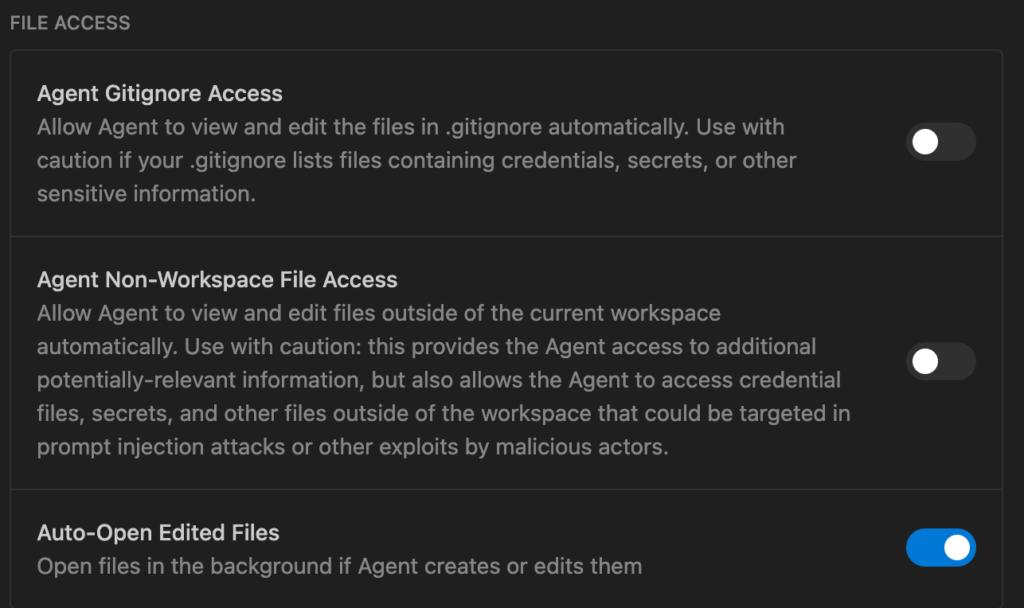 - The Threat: Enables “Path Traversal.” A malicious file could trick the agent into reading your global SSH config or AWS credentials outside the current folder.