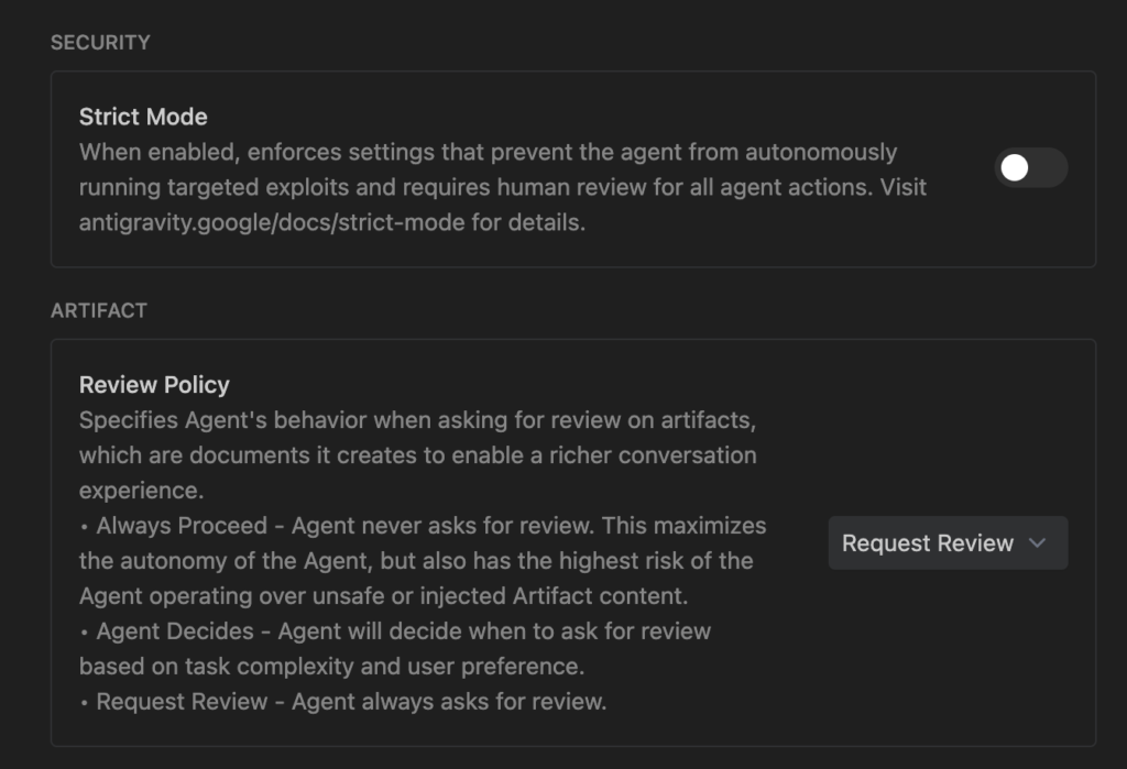 This guide provides a structured overview of Antigravity’s security model, risk profiles, and configuration options. Its purpose is to help you make informed decisions about how much agency to delegate to the AI, and under what conditions. By centralising best practices and clearly outlining the implications of each setting, this guide enables you to balance convenience with control, ensuring that Antigravity remains a powerful assistant rather than an unmanaged risk within your development environment.