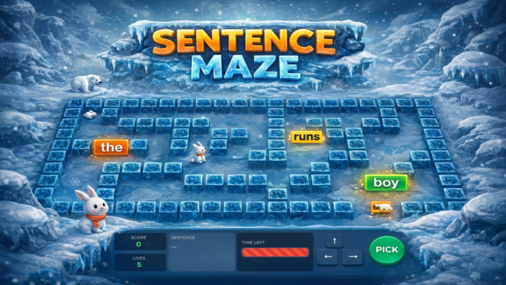 Ice Maze is an educational game designed to help students learn sentence structure through the Colourful Semantics approach. Players navigate a maze, collecting words in the correct order to build grammatically correct sentences. This is a complete lesson in itself and should help students in a highly interactive environment.